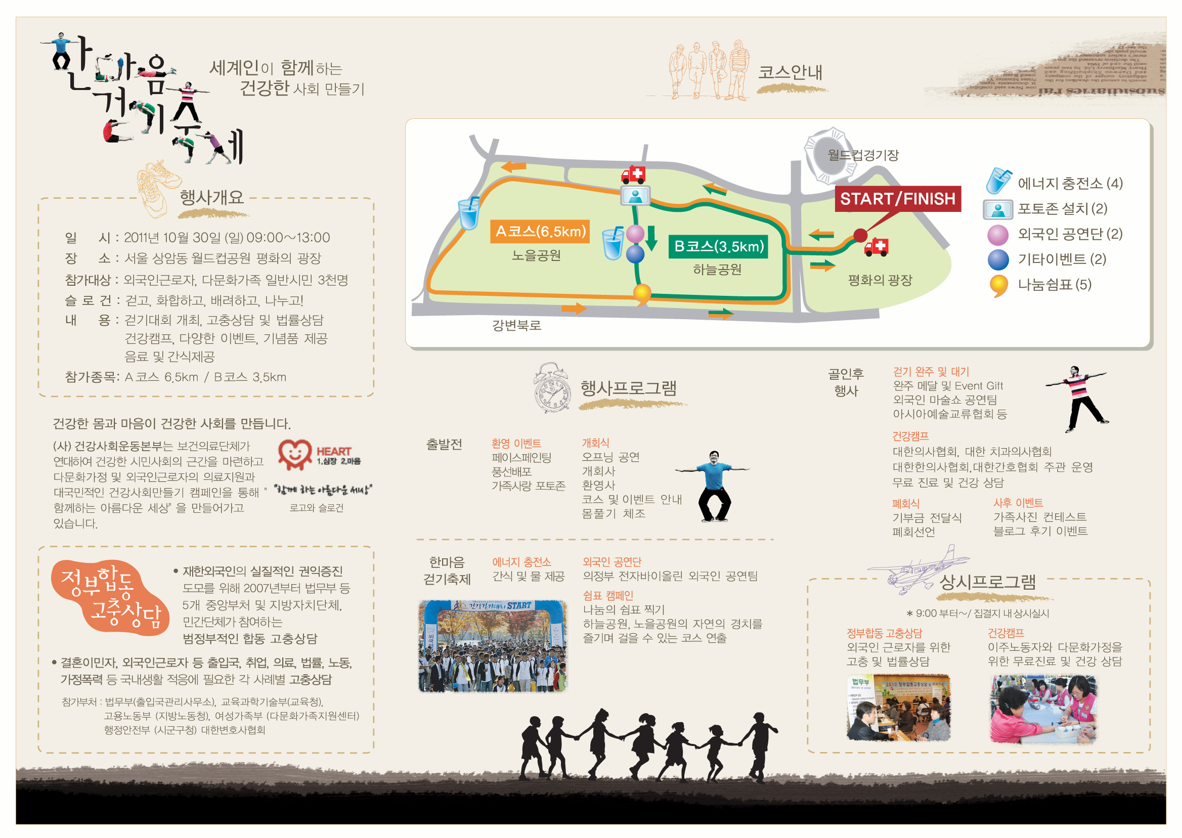 - 행사내용 : 한마음 걷기축제, 노래공연, 고충상담 및 법률상담, 건강캠프(무료진료 및 건강상담) 등