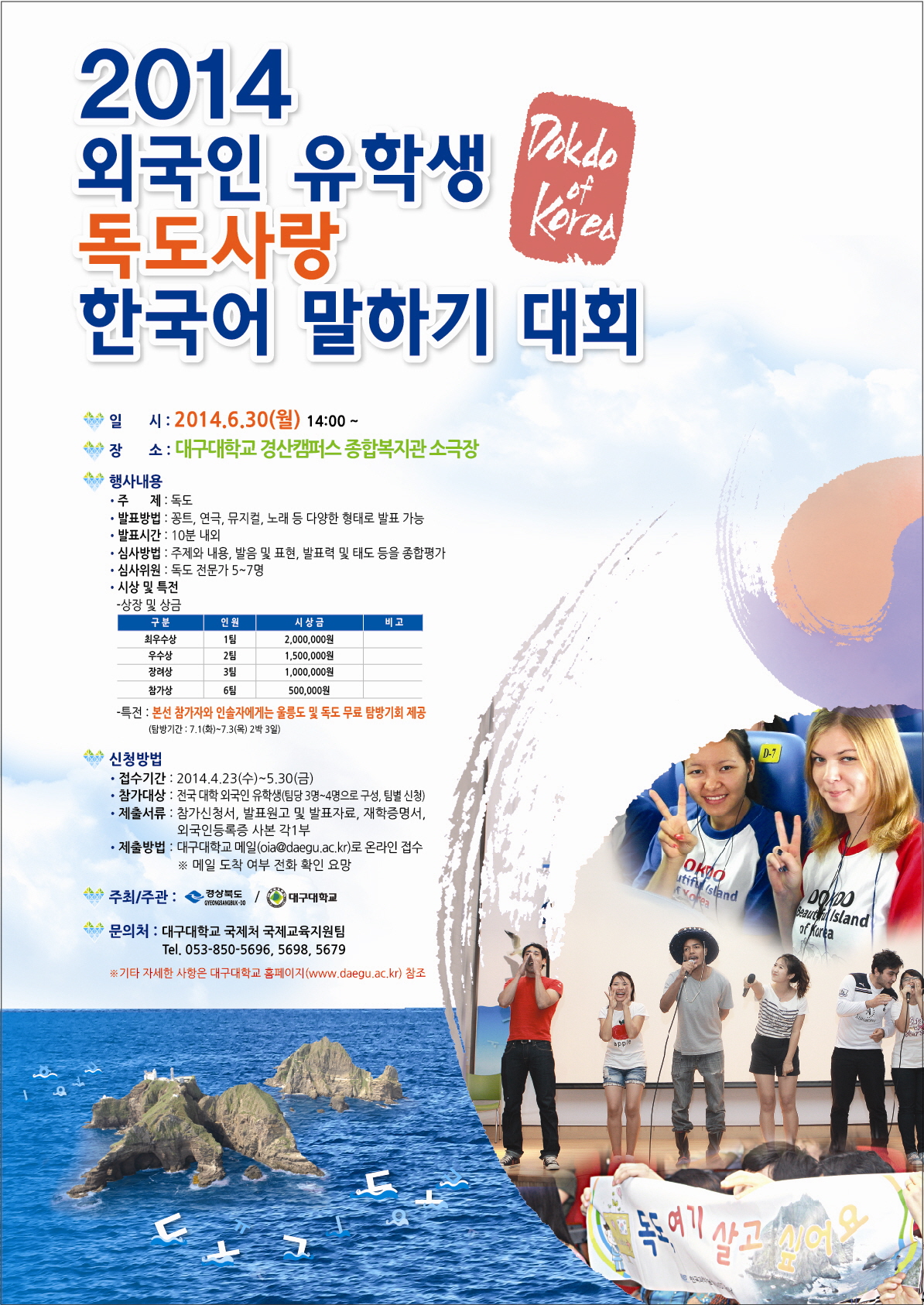 경상북도와 대구대학교는 국내 대학에서 수학 중인 외국인 유학생을 대상으로 독도의 아름다움을 느끼고 독도가 한국의 영토라는 올바른 인식을 확산시키기 위해 '2014 외국인 유학생 독도사랑 한마당'을 개최합니다.