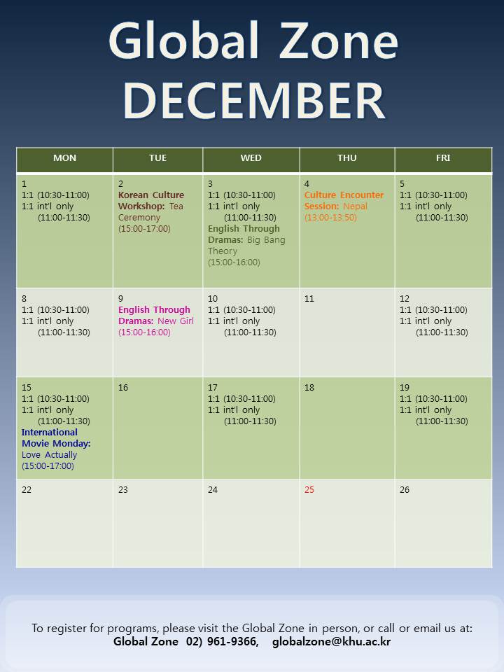 * 문의: globalzone@khu.ac.kr / 02)961-9366 / 청운관 지하 1층 B114호