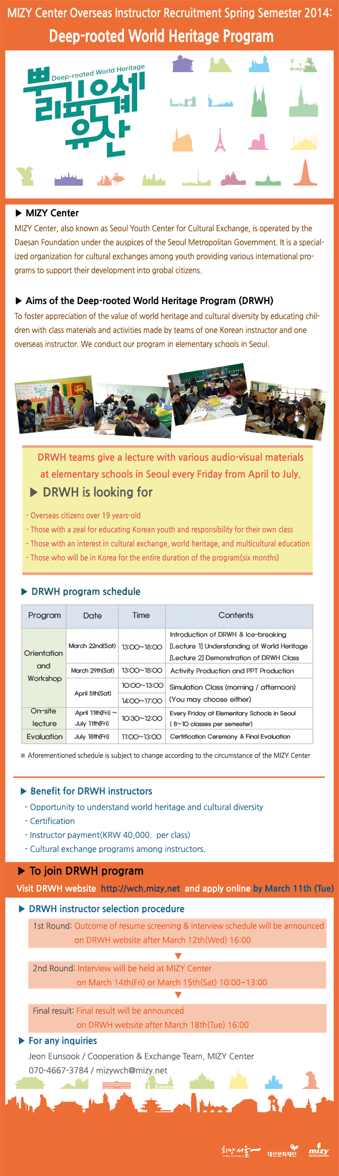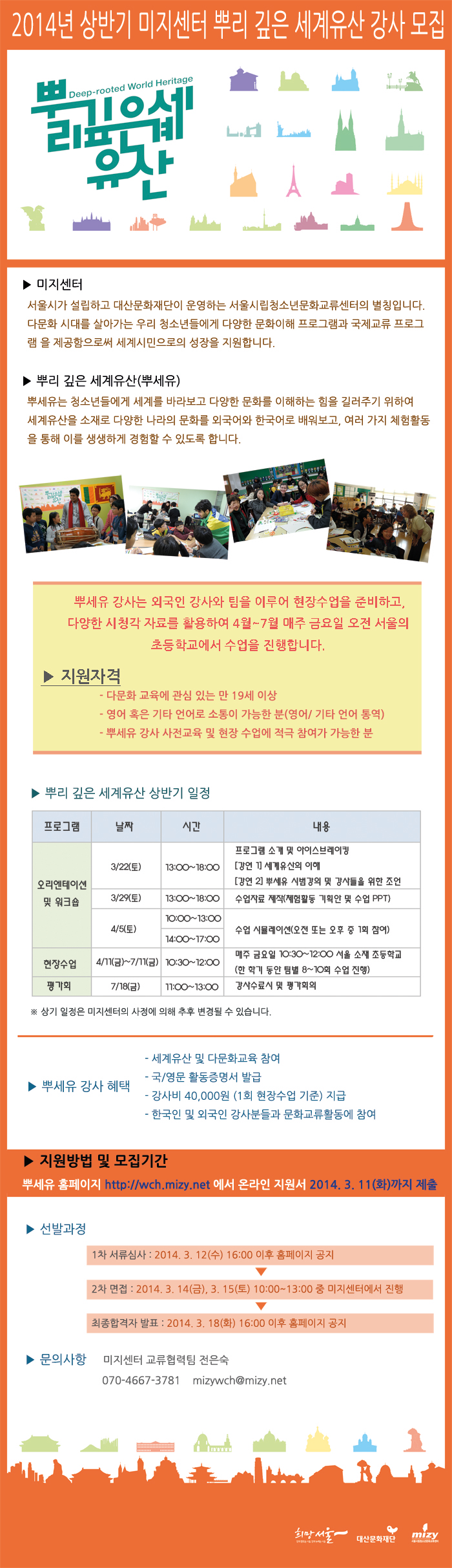 이와 관련, 세계 각 국의 세계유산을 통해 다양한 문화를 소개함으로써 청소년의 다문화 수용 능력을 증진시키기 위해 기획된 '뿌리 깊은 세계유산'의 한국인 및 외국인 강사를 아래와 같이 모집하고지 하오니, 학생들의 많은 참여바랍니다. 감사합니다.