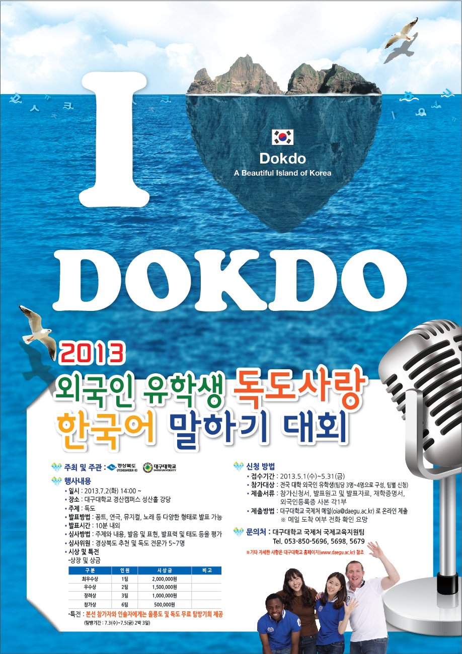 독도를 홍보할 수 있는 독도 알림이를 양성하고자, 2013년 7월 2일 ~ 2013년 7월 5일, 4일 간 외국인 유학생 독도사랑 한마당이 열립니다.