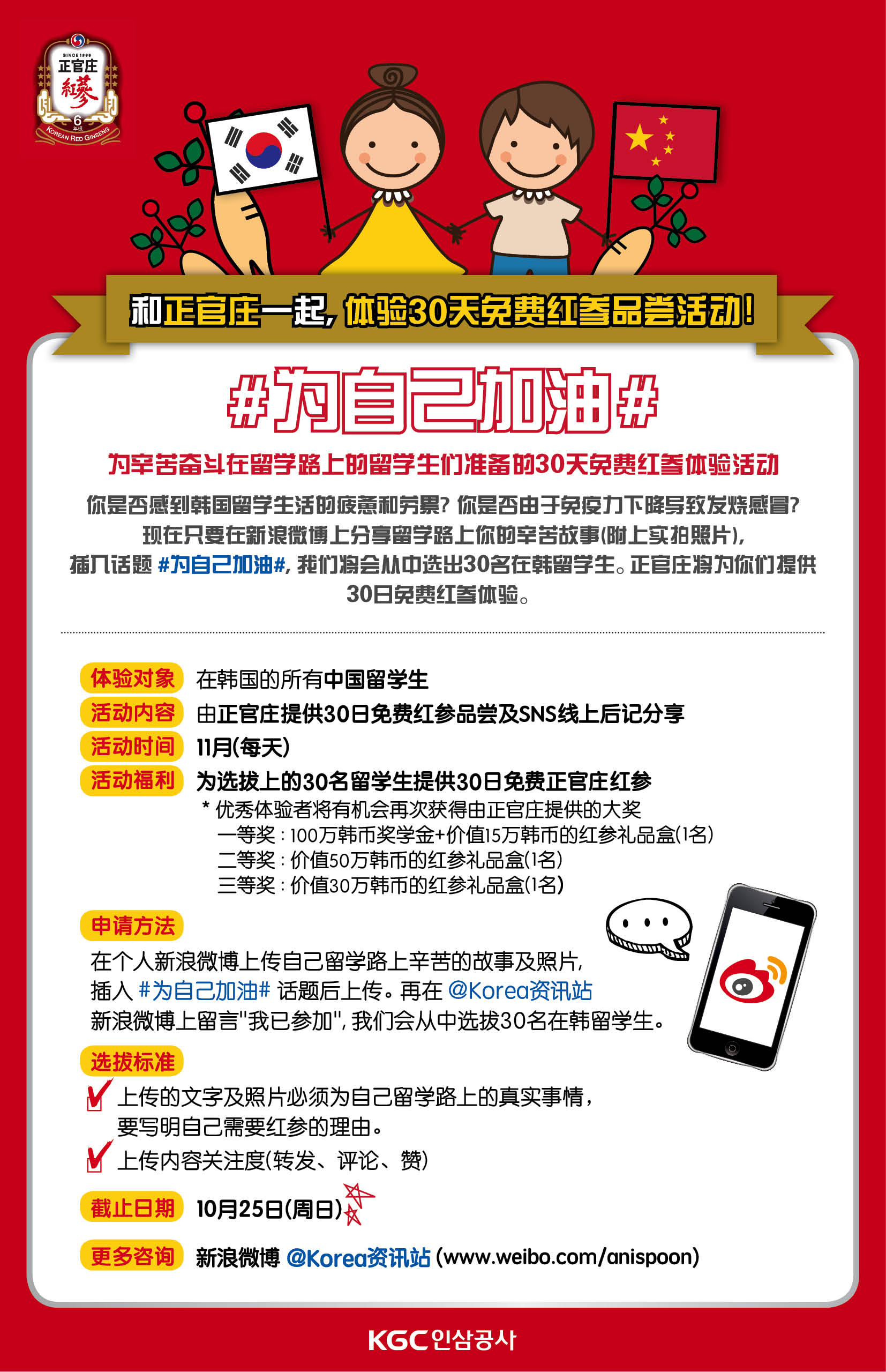 한국에 와서 공부하느라 많이 힘드시죠? 아니면 면역력이 약해 평소에 감기에 잘 걸리시나요? 피로에 지친 여러분의 사연을 사진과 함께 웨이보에 올리면 체험단 30명을 선발하여 1달간 체험할 수 있는 홍삼을 무료로 배달해 드립니다! 최우수 체험자에게는 100만원의 장학금 혜택까지 드려요!
