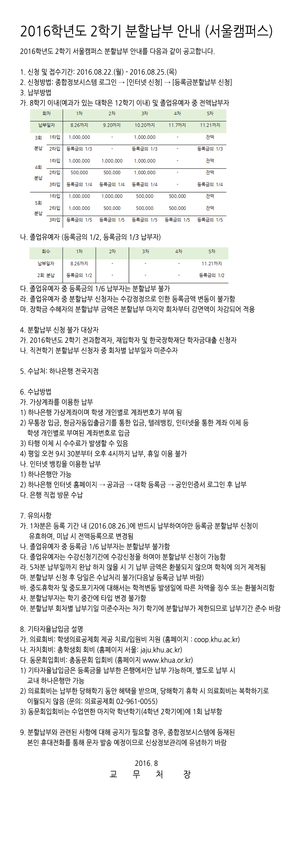 2016학년도 2학기 분할납부 안내 (서울캠퍼스)