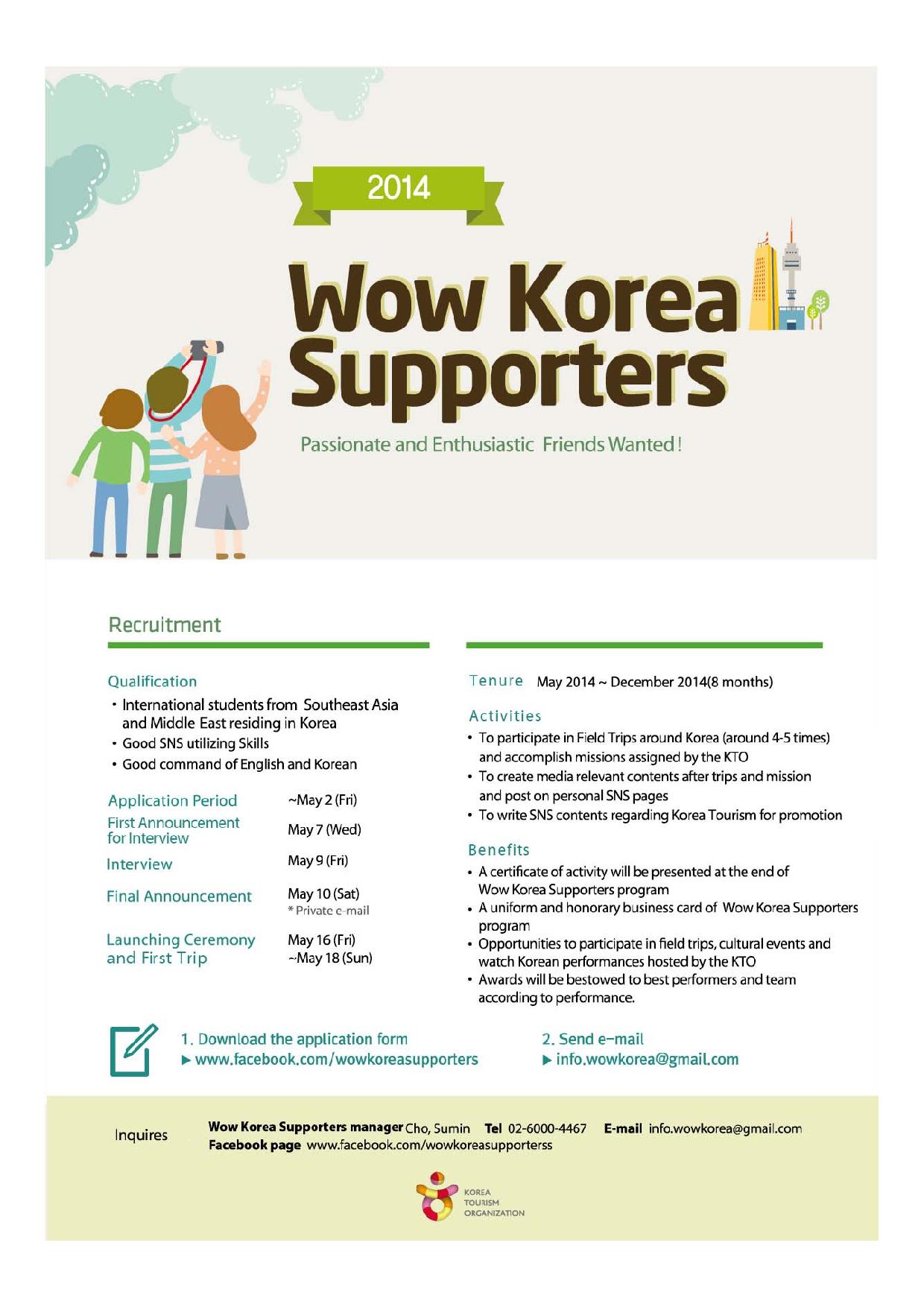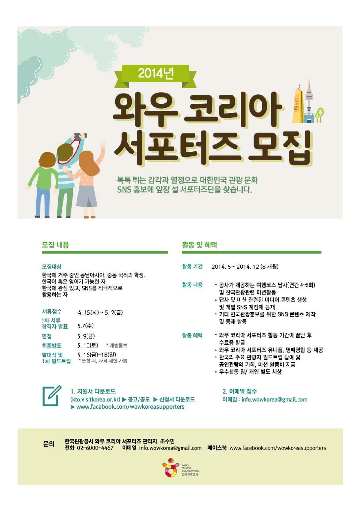 한국관광공사에서는 한국관광 홍보를 위하여 아시아중동지역에서 온 유학생을 대상으로 “한국관광 SNS 홍보단(Wow Korea Supporters”를 모집하여 운영하고 있습니다. 이번 2014년 SNS 홍보단 모집 관련하여 아래와 같이 안내 드리오니, 많은 학생 분들의 참여 바랍니다.