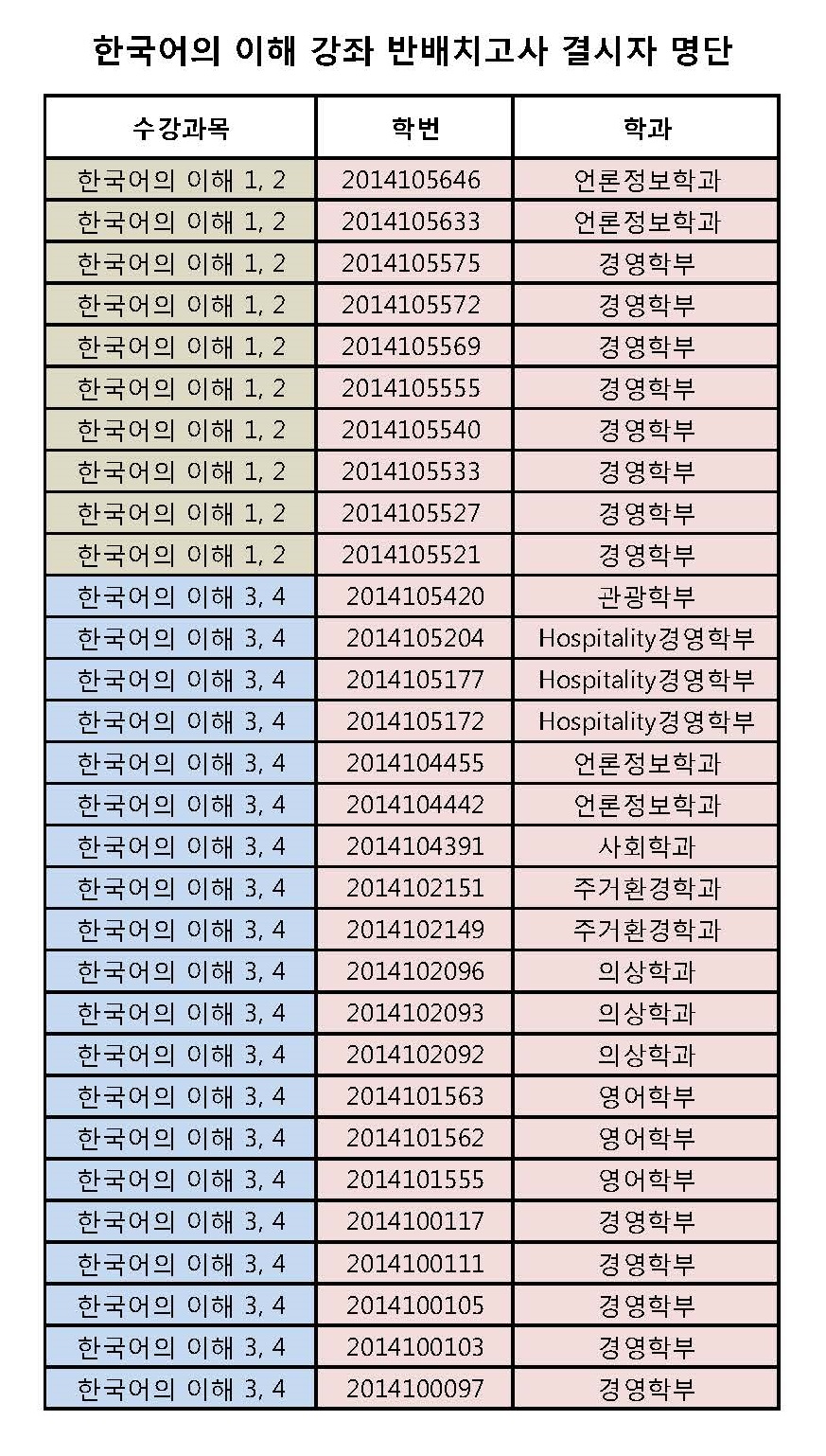 2014-2 한국어의 이해 1, 2 / 3, 4 강좌 반배치고사(9월 첫째주 진행; 추가 반배치고사 9/11(목) 오후 5시)에 참석하지 않은 학생들(첨부파일 참조)은 9/12(금) 오후 5시에 국제교육원을 방문하여 한국어의 이해 강좌 반배치고사를 반드시 보시기 바랍니다.