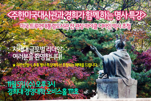 한국과 미국의 관계를 짚어봄으로써 국제사회 속에서 한국이 나아가야 할 방향을 모색하는 자리 <주한미국대사관과 경희가 함께 하는 명사 특강>이 오는 11월 5일(수) 오후 3시 경희대 경영대학 오비스홀 111호에서 개최됩니다.