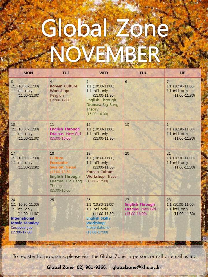 * For more information or to register please contact Global Zone (02-961-9366 or globalzone@khu.ac.kr)